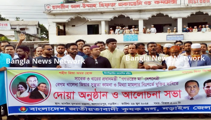 বিএনপির চেয়ারপারসন সাবেক প্রধানমন্ত্রী বেগম খালেদা জিয়ার সুস্থতা কামনা ও নিঃশর্ত মুক্তির দাবিতে দোয়া মাহফিল এবং আলোচনা সভা অনুষ্ঠিত হয়েছে। জাতীয়তাবাদী কৃষক দল নড়াইল জেলা শাখা আয়োজনে শনিবার (২৯ জুন) বিকেলে শহরের আলাদাতপুর এলাকায় এ কর্মসূচি পালিত হয়।